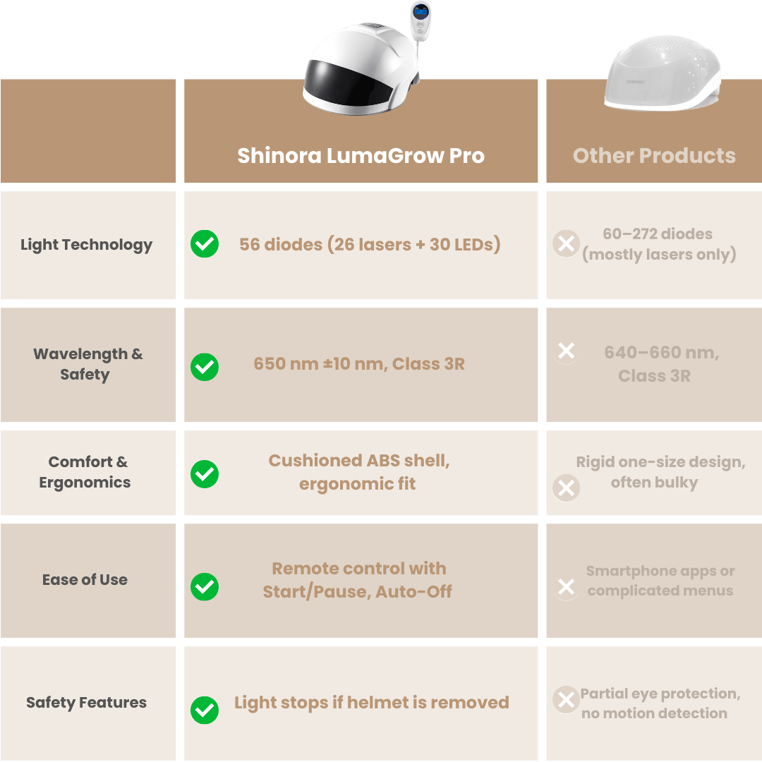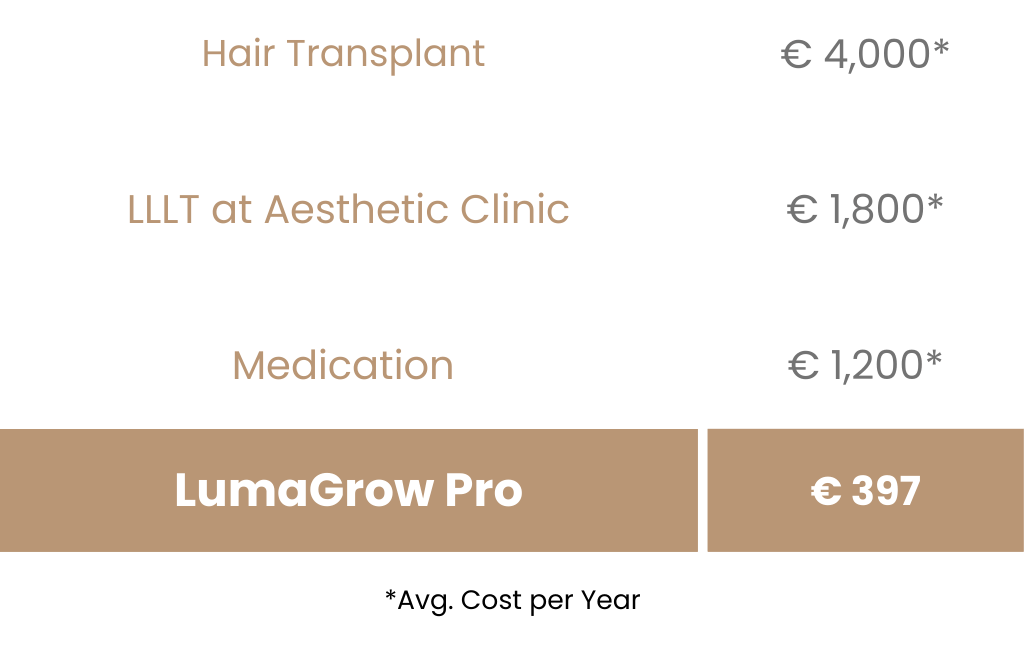 Why spend hundreds every month on clinic visits or medication when you can start at home with the LumaGrow Pro? It supports natural hair growth—at just a fraction of the cost of other methods.