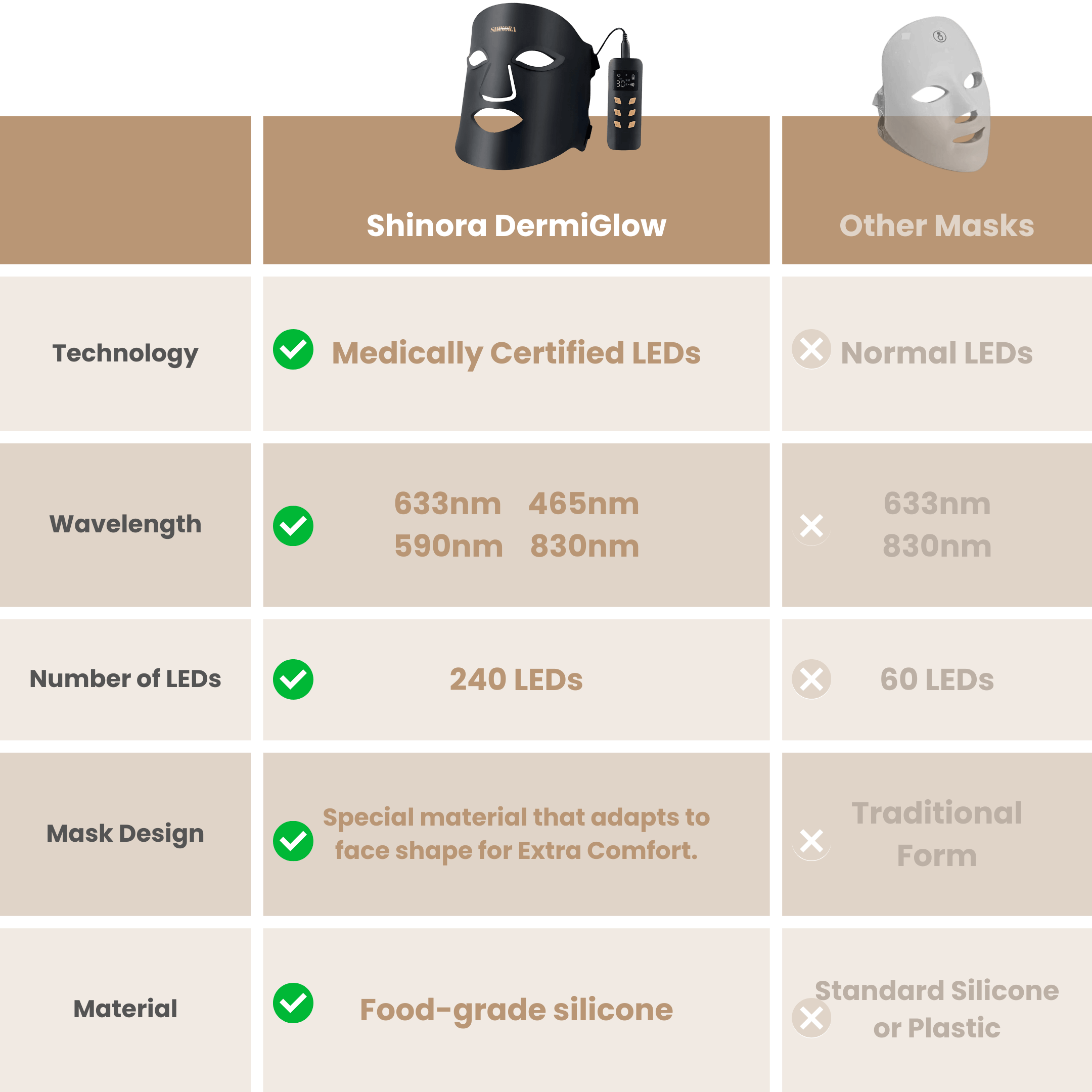 DermiGlow offre plus de LED, des longueurs d'ondes cliniquement testées et un confort optimal – tout cela certifié selon des normes strictes. Le choix évident pour une peau plus belle et soignée !