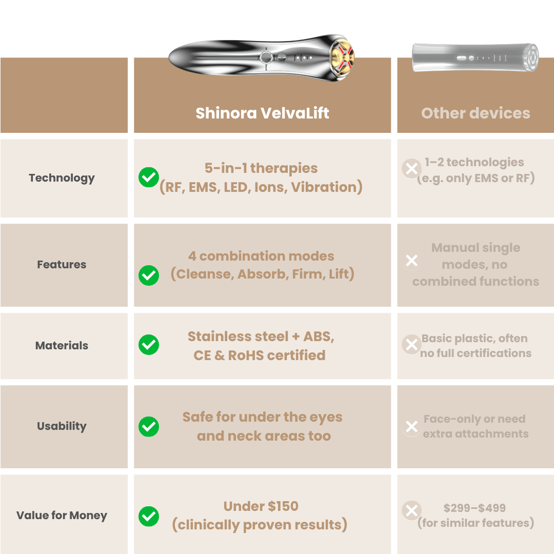 Clinic devices are stronger, but you’ll need appointments—and they cost more. VelvaLift brings professional-inspired tech into your home, and with regular use, you’ll still see visible results.